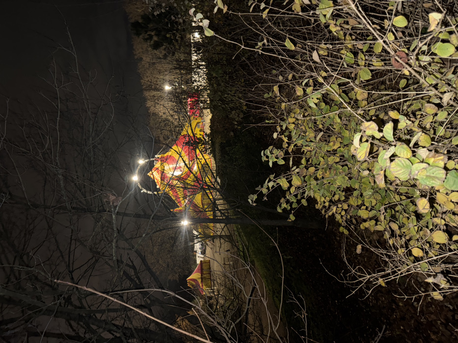 A dimly lit outdoor scene at night features trees framing a large, illuminated structure with a distinctive conical roof. The structure is decorated with a vibrant yellow and red pattern and is outlined with a string of lights. To the right, leafy branches with yellowing leaves contrast with the bare branches of a tree on the left. The background sky is dark and cloudy, adding to the overall nocturnal atmosphere.