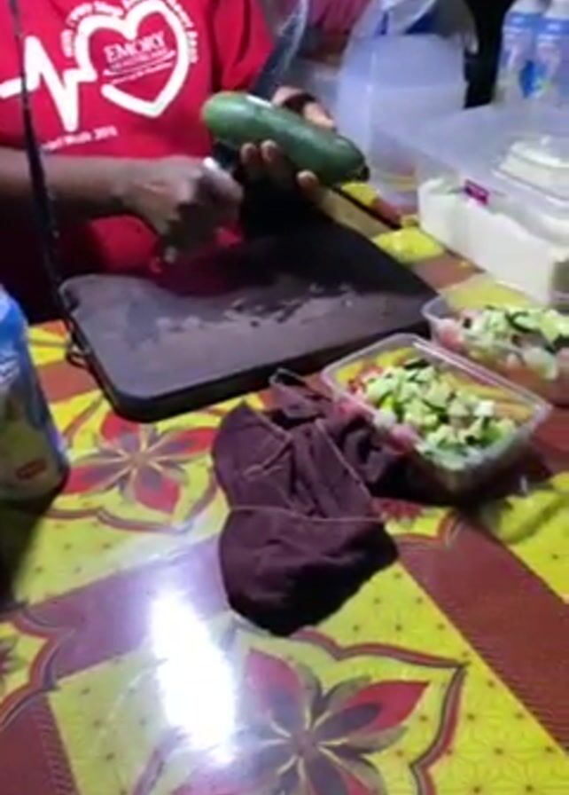 A person is cutting a cucumber on a wooden cutting board. The person is wearing a red t-shirt with a white logo on it. There are plastic containers with diced vegetables on the table next to the cutting board. The table has a yellow tablecloth with a pattern of red and brown flowers. A blue bottle and a brown cloth are also on the table. Another person is visible in the background and a person is filming the video with a smartphone. The video appears to be taken at an outdoor food stall.