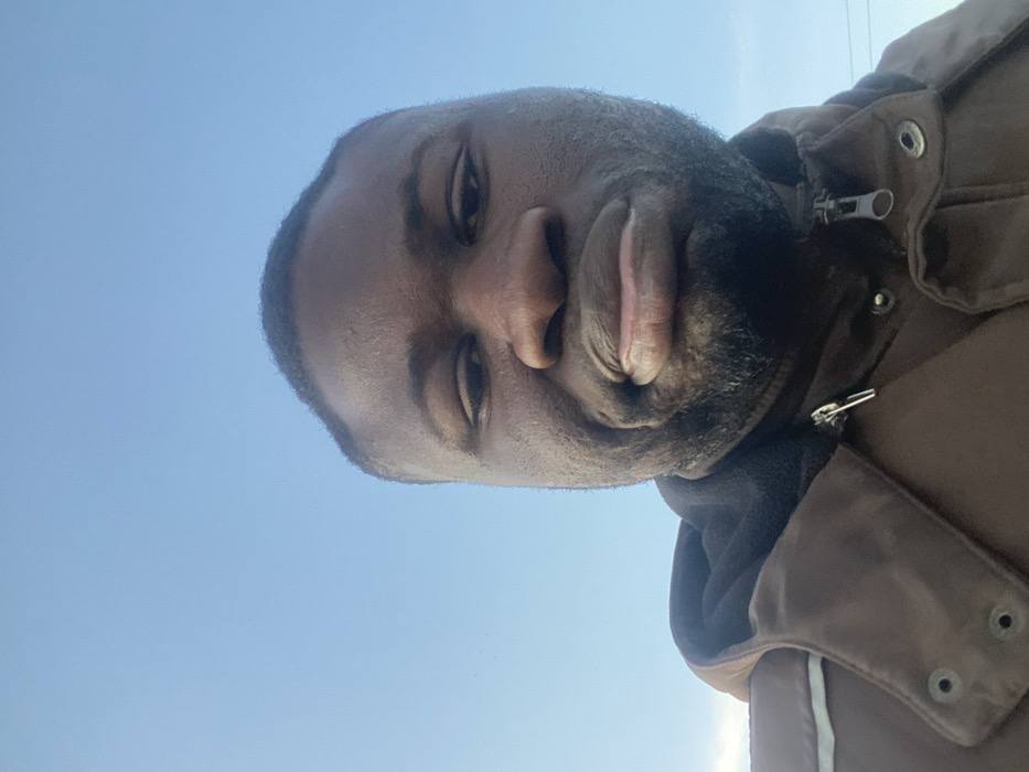 A man with dark skin, a beard, and a jacket with a zipper and buttons is seen from a low angle. The sky is a clear blue in the background. His face is tilted upwards, with the camera pointing slightly downward towards him. He appears to be looking at the camera, or slightly past it. The jacket is brown and appears to be made of a thicker material.