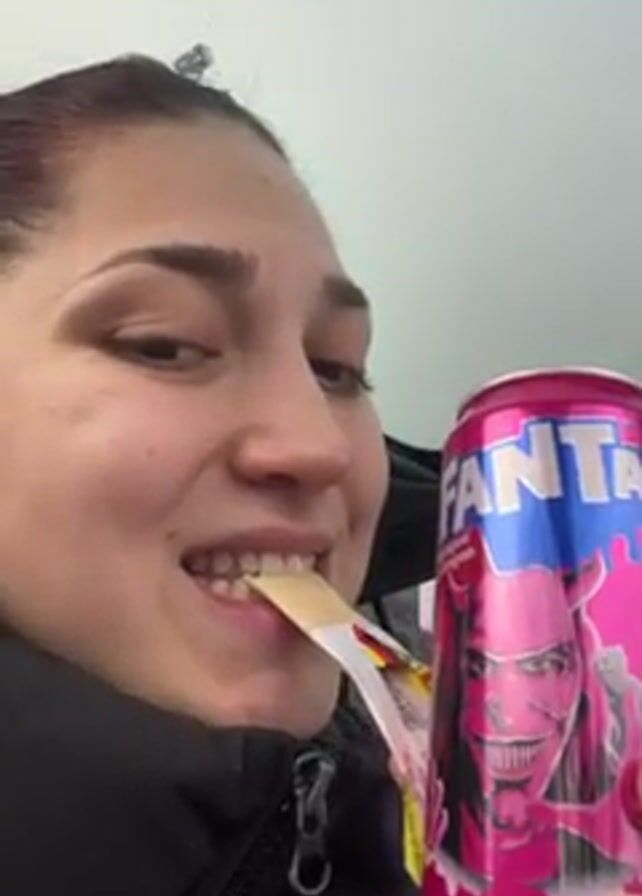 A young woman is seated in a car, eating a block of cheese. She is holding a can of Fanta soda. The woman has medium-length brown hair pulled back and is wearing a black puffer jacket. She looks up at the sky, which is visible through the car's sunroof. A building labeled "La Foire" is visible through the window.