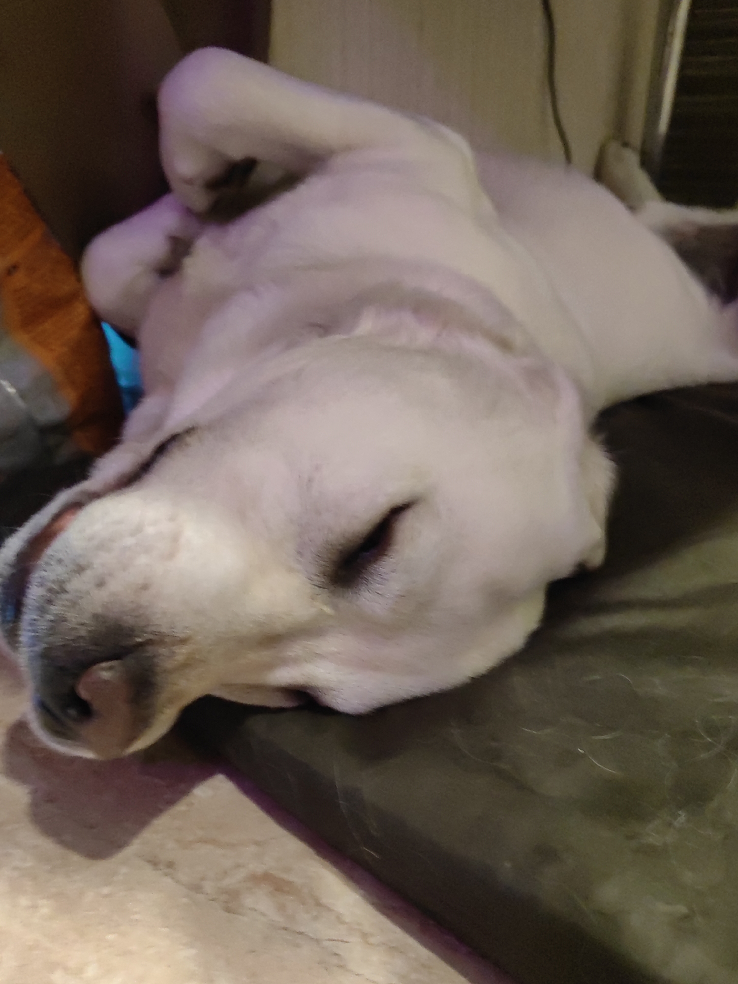 A light-colored canine, likely a Labrador Retriever, is depicted in a supine position, resting on a dark, upholstered surface within an indoor environment in Mytishchi, Russia. The dog's head is oriented towards the lower left, with its eyes closed and mouth slightly ajar, revealing a dark gum line. Its pink nose is prominent. The upholstered surface exhibits scattered light-colored fur, consistent with shedding. Partially visible in the upper left background are elements including an orange fabric or object and a light cyan glow. The floor in the lower left corner consists of light-colored, possibly tiled, material. Shadows are cast on the floor from unidentified objects to the left of the canine.
