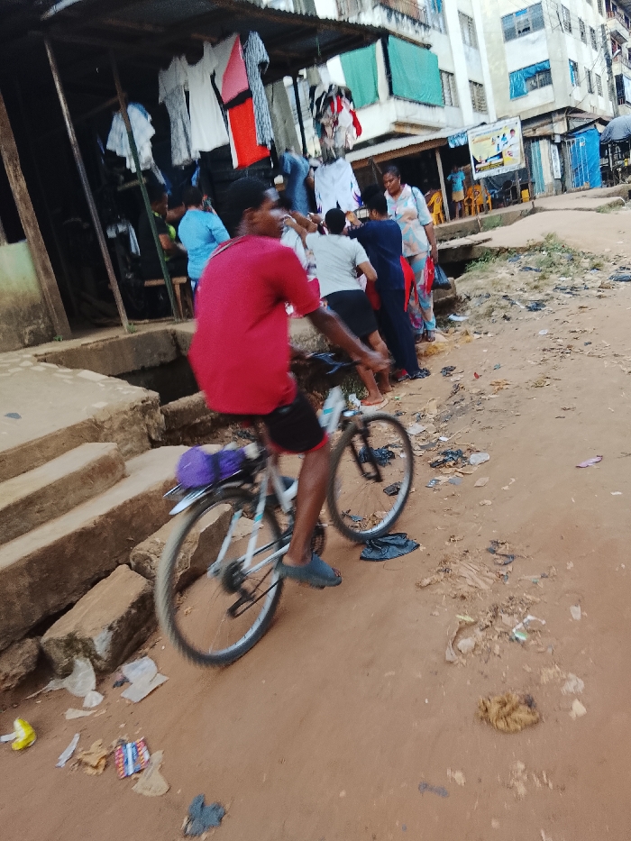 A man in a red shirt rides a silver bicycle on a dirt road. Several people are near a shop with clothes hanging outside. The road is littered with trash. There is a building in the background. The ground is uneven and sandy.