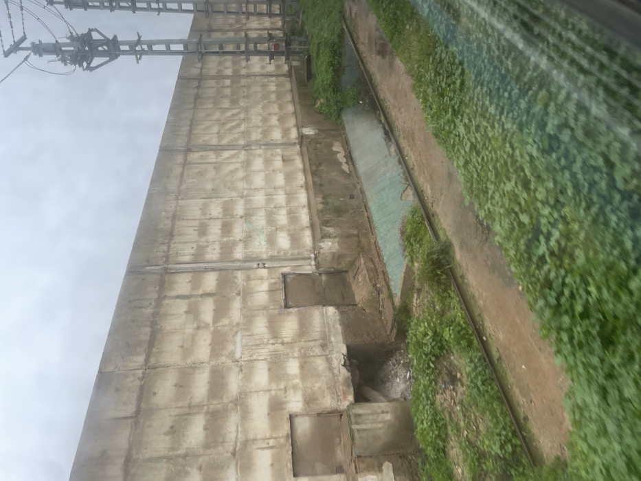 A tall, blocky concrete structure looms under a cloudy sky, with power lines visible at the top. Vegetation spills over an adjacent ditch. Several square openings punctuate the lower part of the wall. An overgrown drainage channel with blue tinges runs alongside a narrow path, densely lined with green plants. The angle suggests a ground-level, slightly tilted perspective.