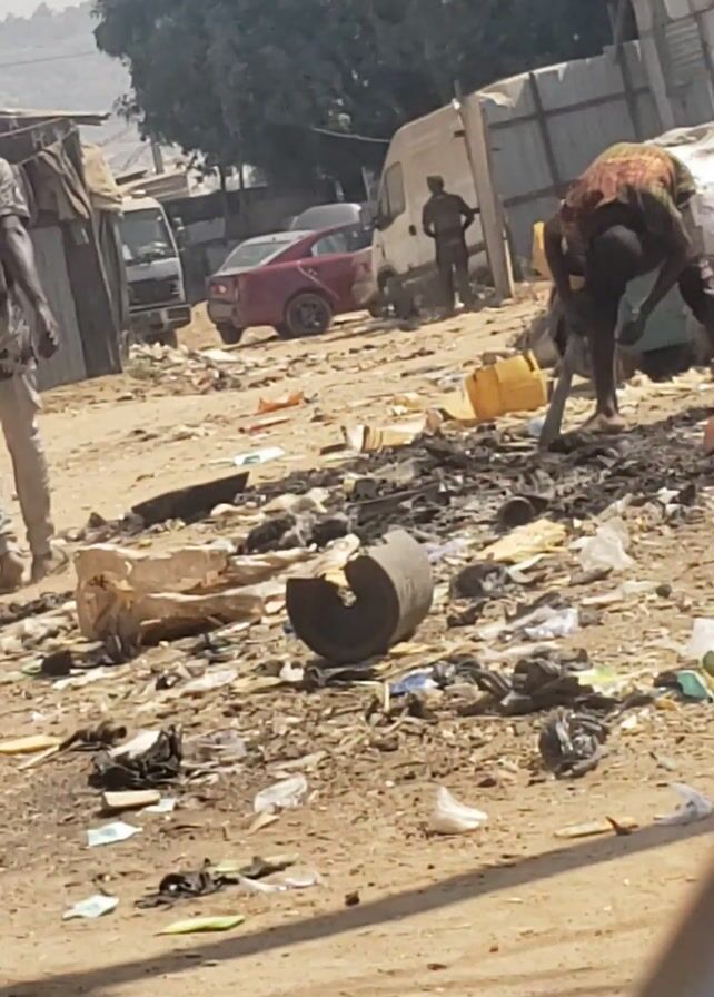 dirt road filled with trash. In the first frame, an individual is seen amidst the garbage, possibly sorting through it with their hands. The next frames show three individuals walking along the trash-strewn road. Two of them are wearing headscarves, one blue and one brown, and carrying rectangular containers. The third individual, ahead of the other two, is wearing a patterned shirt and trousers. Overhead power lines are visible against the sky. The scene appears to be in a low-income area.