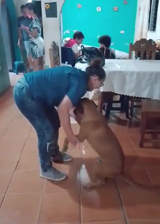 A woman wearing a blue shirt, ripped jeans, and grey sneakers is hugging a medium-sized, light brown dog in a room with tiled floors. The dog is standing on its hind legs and has its front paws around the woman's waist. The woman is bent over, hugging the dog tightly. The room appears to be a dining area with a large table covered by a white tablecloth in the background. Several people are visible in the background, some sitting at the table and others standing near an arched doorway. The walls are painted in different colors, including green and off-white. There is a window with white curtains in the background. The lighting in the room is bright.