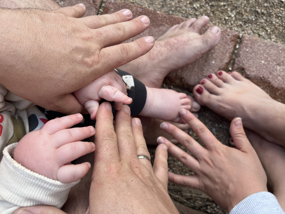 - "The image displays a close-up, downward view of the hands and feet of four individuals, including an infant, interacting on an outdoor surface, located in Lloret de Mar, Spain" by FM-4GKkh1, licensed under CC BY 4.0