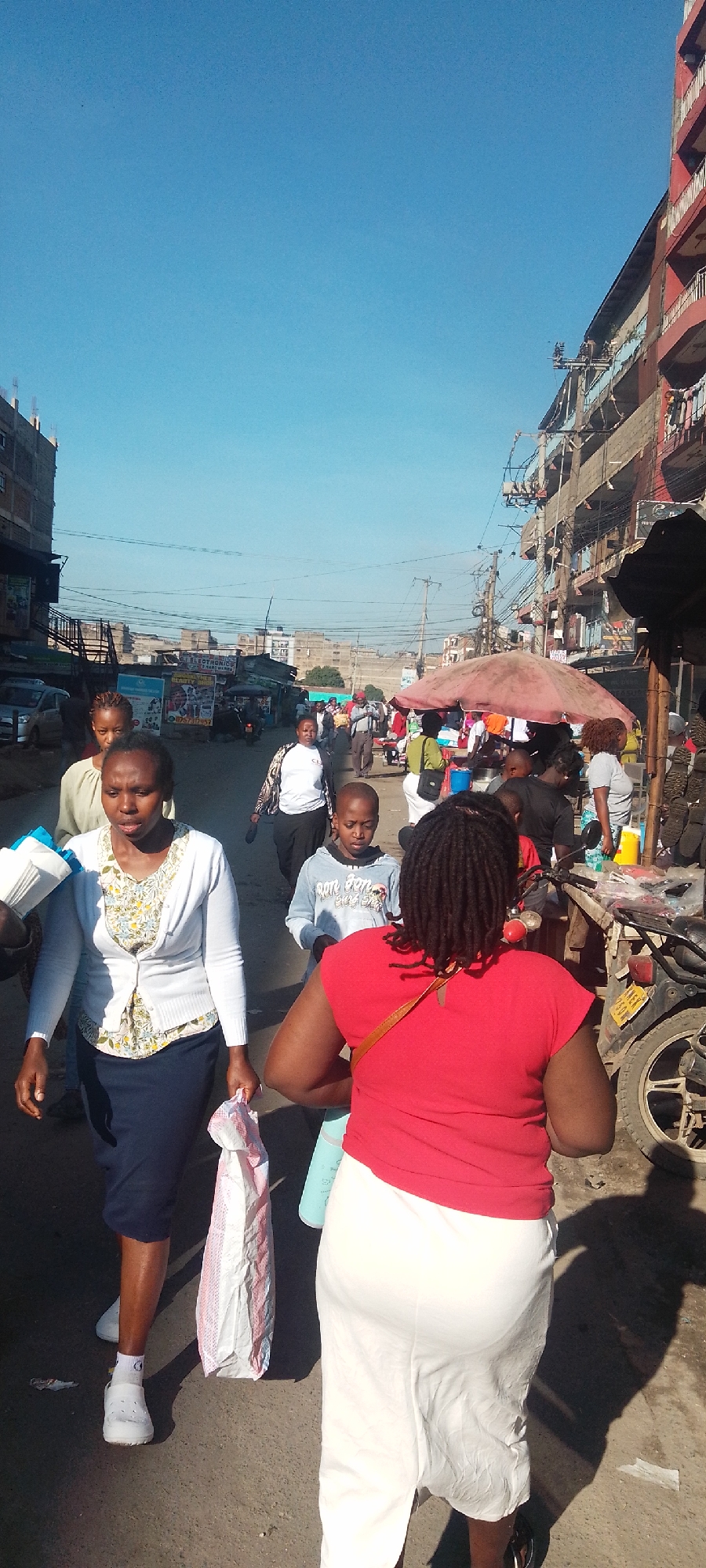 street scene in Nairobi, Kenya. The location is characterized by buildings of medium to high height constructed mainly out of concrete. A mix of commercial and residential uses are apparent. Overhead power lines are visible, creating a network of wires against the clear blue sky. People are walking along the street. A woman with dreadlocks, wearing a red shirt and white skirt, stands in the foreground, with her back to the viewer. A woman in a white cardigan and a dark skirt is walking in the opposite direction, carrying a white and pink plastic bag. There is a motorbike to the right of the dreadlocked woman. Vendors are selling goods from stalls under an umbrella and along the roadside. Other pedestrians can be seen further down the street and in the background, indicating a moderately busy commercial activity.