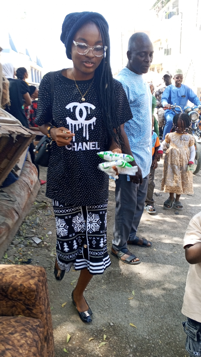 A daytime outdoor scene in Sabon Gari East, Nigeria, features a young adult female as the primary subject, moving right to left across a dirt ground