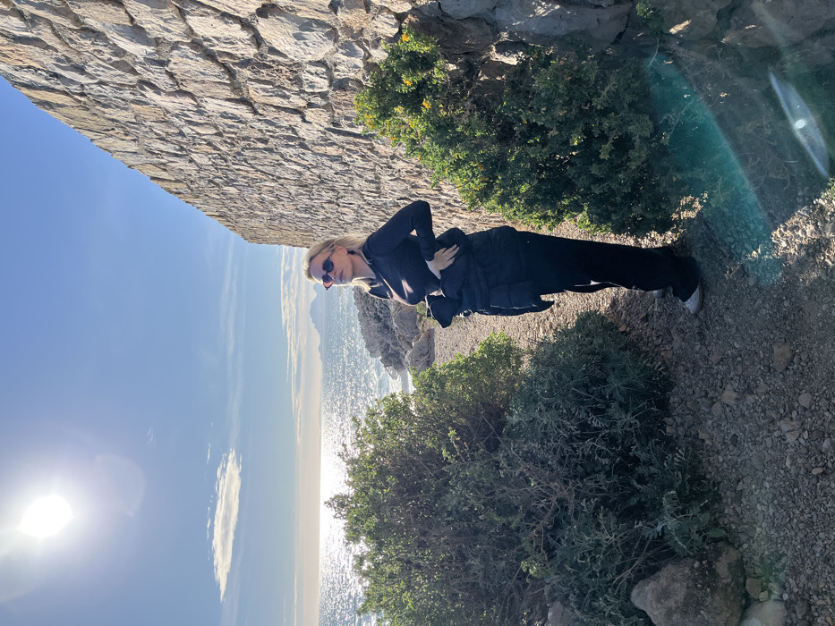 A woman stands on a rocky path beside the ocean. She wears sunglasses, a dark jacket, and pants. A stone wall is to her left. Lush green bushes surround her. The sea stretches to the horizon under a sunny blue sky. The sun glares in the distance. The photo is taken at an unusual angle, making the ground appear vertical.