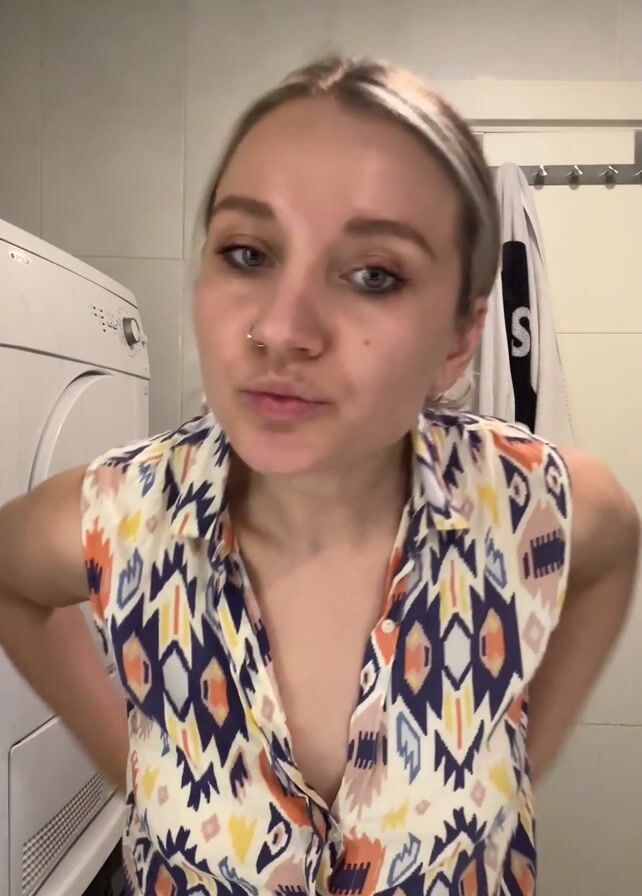 A young woman with light blonde hair and blue eyes is standing in a bathroom, facing the camera. She is wearing a sleeveless button-up shirt with a colorful geometric pattern, and brown shorts are visible beneath. She is buttoning up her shirt and adjusting it. To the left of the frame are a white washing machine and a dryer stacked on top of each other. The bathroom has white tiled walls. A white towel is hanging on a rack on the wall behind her. The lighting in the bathroom is bright.