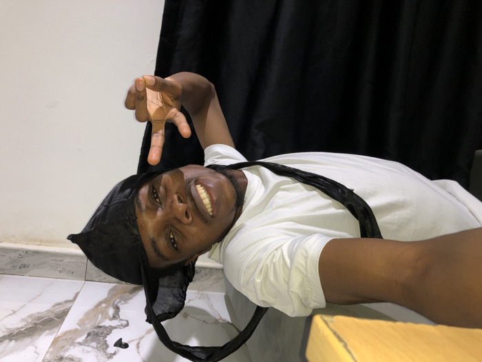 A man with dark skin and a black durag grins while posing for the camera. He is lying down, wearing a white t-shirt. His right hand is raised, fingers splayed in a casual gesture. A black curtain hangs in the background. The floor has a marble-like pattern. A light-colored table edge is visible in the lower right corner.