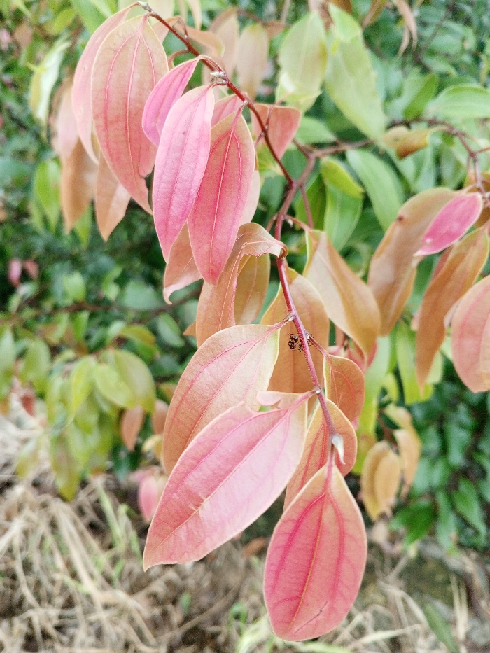 The image captures a close-up of a plant branch adorned with numerous young, developing leaves in Ciherang, Indonesia. The leaves are predominantly elliptical with pointed apices, displaying vibrant pinkish-red and brownish-orange hues, indicating new growth. A small, dark-bodied ant is observed stationary on a slender, reddish-brown stem near the center of the frame. In the blurred background, mature green foliage is visible, with some dried, light-brown plant matter present at the bottom of the image. The scene is an outdoor natural environment. No human subjects are present.