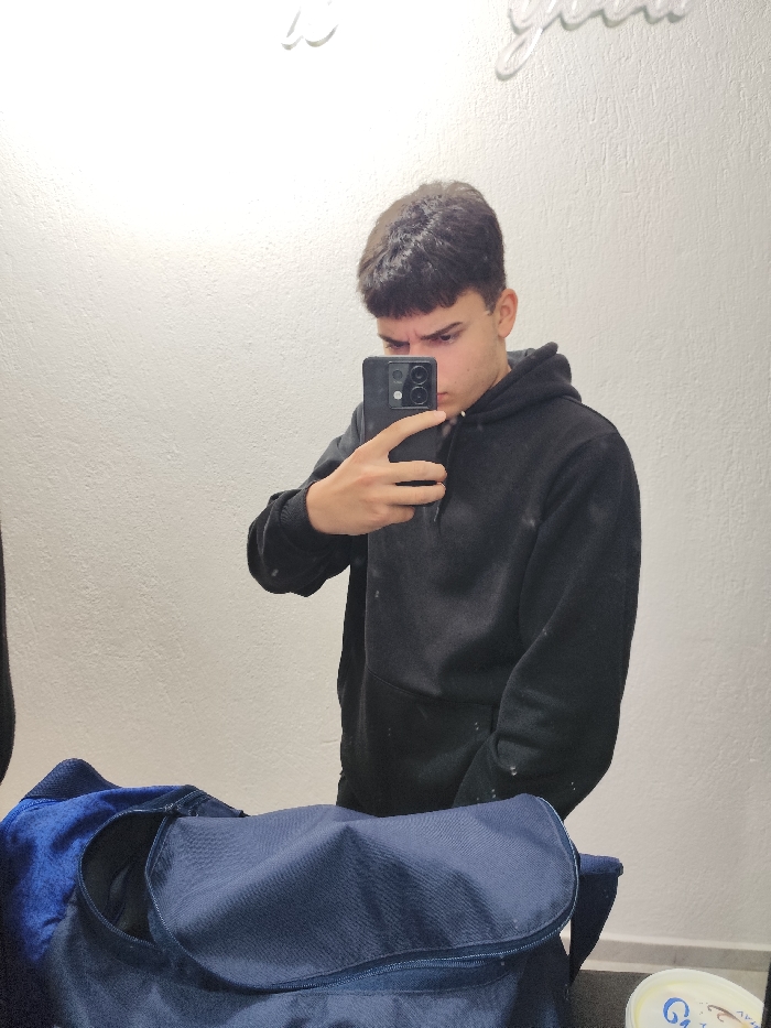 An indoor mirror selfie depicts a young male in Hrishteni, Bulgaria, positioned centrally within the frame. The male subject, likely a teenager or young adult, has short, dark brown hair with a frontal fringe. He is wearing a dark, possibly black, hooded sweatshirt that exhibits multiple small white or light-colored specks. His left hand holds a black smartphone, featuring a multi-lens camera module, positioned to capture his reflection. The subject's gaze is directed towards the smartphone, and his eyebrows are slightly furrowed. In the foreground, a dark blue duffel bag or gym bag, partially open, rests on a dark surface. A blue, possibly textured, fabric is visible inside the bag. The background consists of a plain, light-colored, textured wall. A white, decorative element, resembling cursive script, is mounted on the wall in the upper left quadrant. A small, light-colored circular container with blue accents is partially visible on the far right edge of the frame, near the bottom.