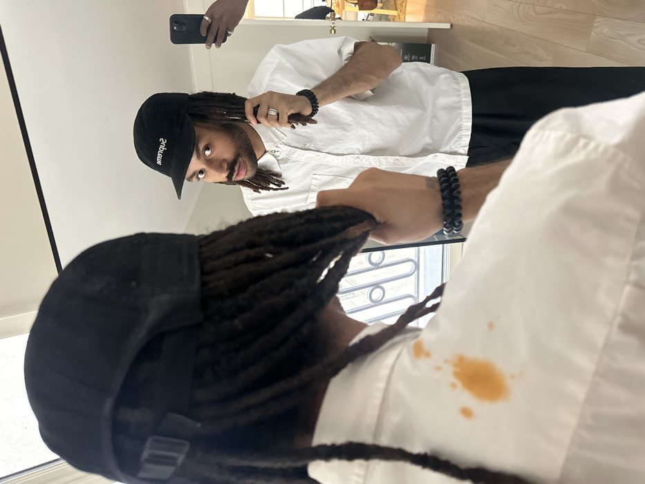 The image depicts a mirror reflection of an individual indoors in the city of Paris, France. The central subject is a male with dark skin, dreadlocks, and a mustache, wearing a black baseball cap with "Supreme" embroidered in white, a white short-sleeved button-up shirt, and black pants. A small silver crucifix pendant hangs from his neck. He wears a black beaded bracelet on his left wrist and multiple silver rings on both hands. In the reflection, he is looking directly forward, with his right hand raised, fingers intertwined with his dreadlocks. The foreground shows the back of the subject's head, featuring the black cap and dreadlocks, along with his left shoulder. An irregular orange-brown stain, consistent with a liquid or food spill, is distinctly visible on the left shoulder blade area of his white shirt. A dark-colored smartphone, held by a hand adorned with silver rings (consistent with those worn by the subject), is visible in the upper right of the reflection, positioned as if capturing the mirror image. The background of the reflection reveals a window featuring a white, ornate wrought-iron railing, characteristic of Parisian architectural balconies or windows, with an overcast sky visible beyond. To the right of the reflection, an open doorway leads to an adjacent room with light wooden flooring and minimal furnishings.