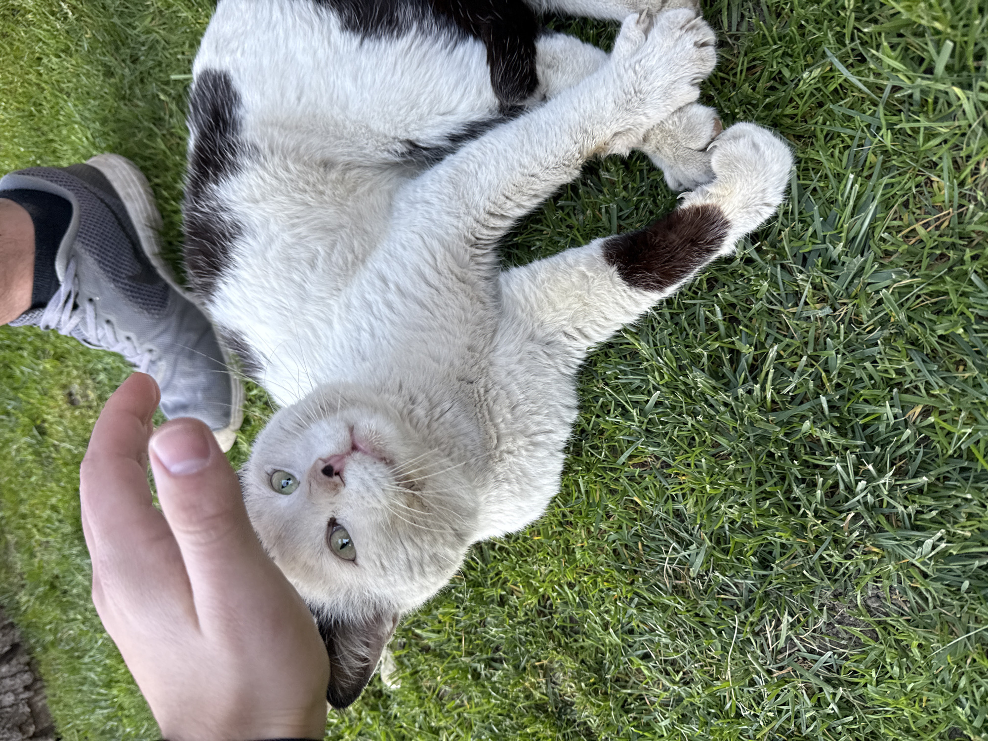 The scene depicts a white and black cat lying on a patch of green grass, possibly in a garden or park. A person's hand is reaching towards the cat, suggesting an interaction. A gray sneaker is also visible near the cat. The location is Ihtiman, Bulgaria.