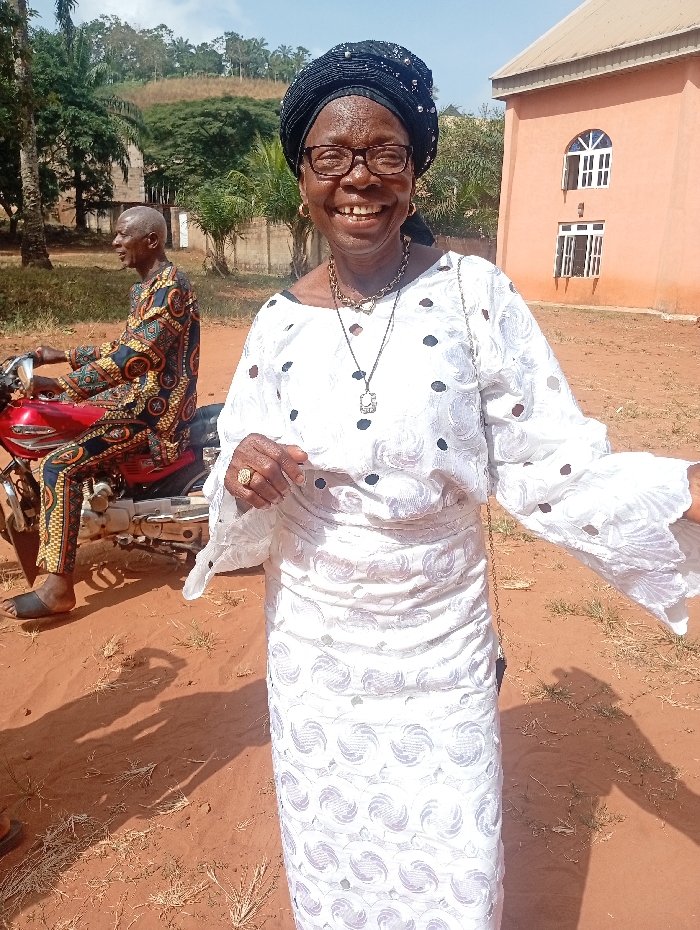 An outdoor scene in Nsukka, Nigeria, features an elderly woman and an elderly man on a reddish-brown dirt ground with sparse dry grass