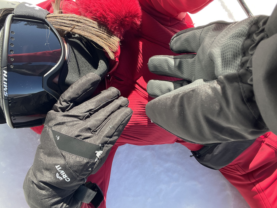 The scene depicts two individuals in a snowy outdoor environment at a ski resort in Bansko, Bulgaria. The image is taken from a low-angle, first-person perspective, looking towards another individual positioned slightly above and in front. The primary subject wears winter apparel suitable for skiing or snowboarding. This includes a bright red ski jacket, a black balaclava covering the lower face, a black ski helmet, and black "SMITH" brand ski goggles with dark, reflective lenses. Brown hair is visible extending from beneath the helmet. This subject's right hand is covered by a black "CRIVIT" brand ski glove, featuring a reflective strip and small specks of snow on its surface. In the immediate foreground, a second individual's hand, presumably the photographer's, is visible, covered by a black glove with a textured, light grey pattern on the palm and fingers. This hand is positioned centrally, reaching slightly upwards towards the visible subject. The background consists of bright, undisturbed white snow, indicative of a clear, sunny day. The attire and setting strongly suggest participation in winter sports on a ski slope or similar area.