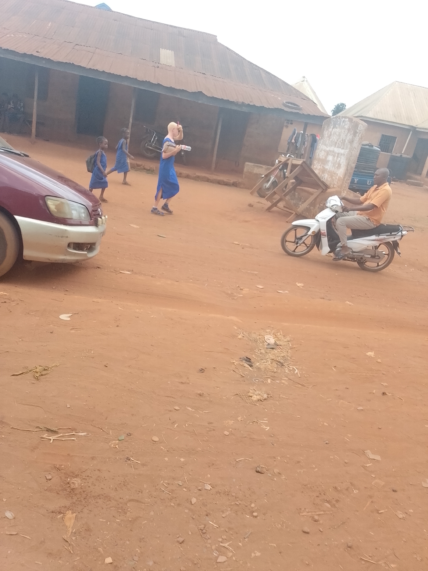 The image depicts a street scene in Ejule, Nigeria, characterized by a reddish-brown dirt road. A burgundy-colored car is partially visible on the left side of the frame. Three children in blue uniforms are walking past the car. A person with albinism, also in a blue dress, is walking alongside the children. A man on a white motorcycle is driving on the right side of the road. In the background, there are buildings with corrugated metal roofs. A stack of furniture, a water tank, and laundry hanging on a line are also visible.