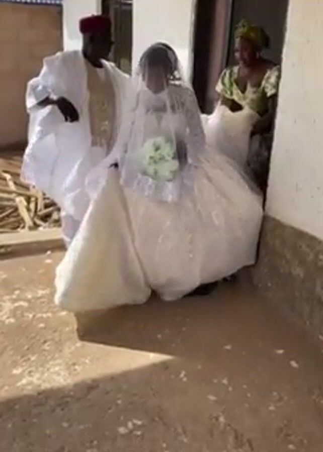 A bride in a white gown and veil is escorted outside of a building by a man wearing a traditional white robe and a maroon hat. The bride carries a white bouquet. A woman in a floral dress stands in the doorway behind them. The ground appears to be dirt. To the side is a pile of sticks. The building has a white facade and a blue roof.