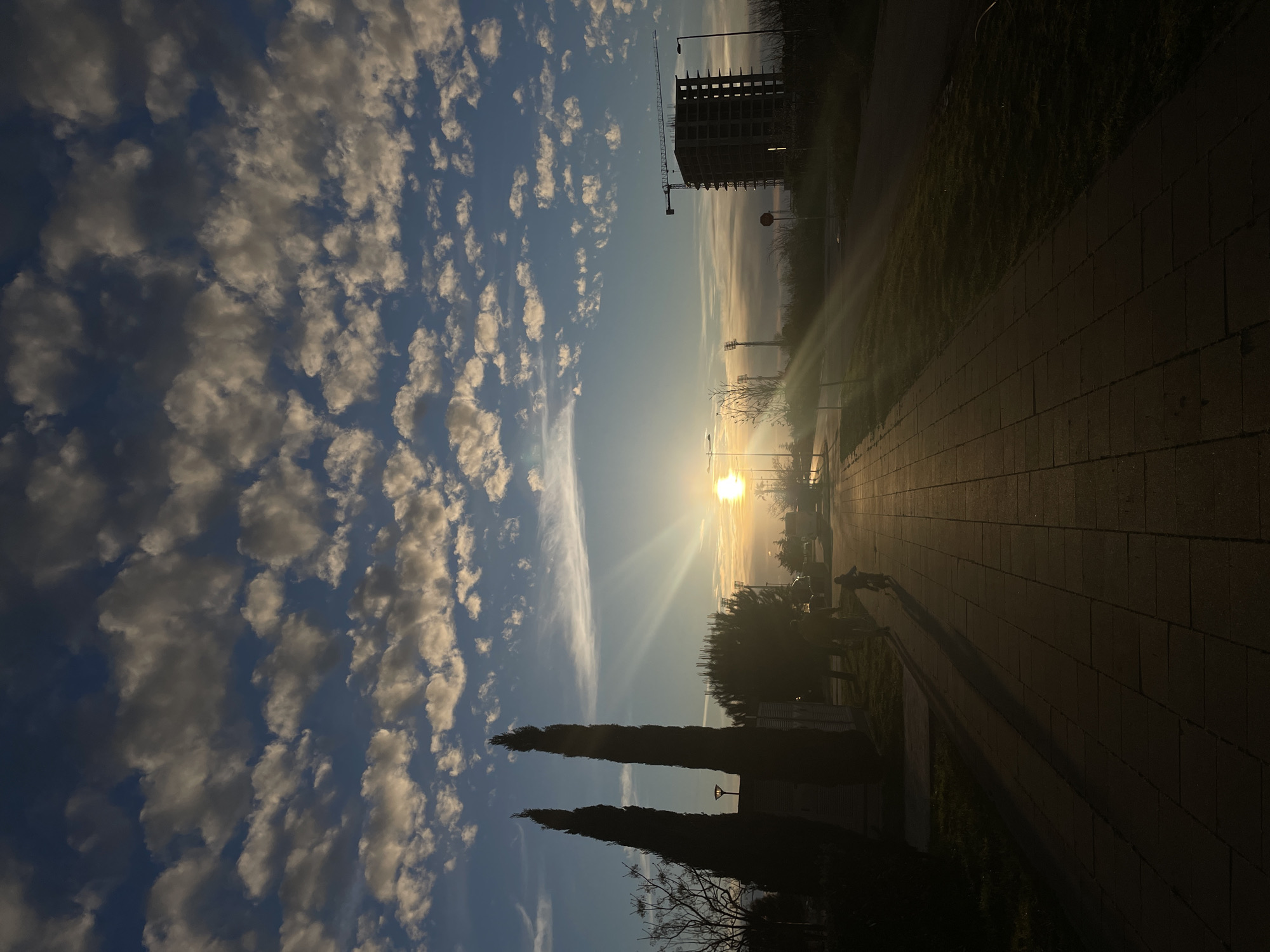 The image depicts a street scene in Bar, Montenegro, likely at sunrise or sunset. The sky is a vibrant blue with scattered cumulus clouds. The sun is positioned low on the horizon, casting a bright glare and long shadows along a brick-paved pedestrian walkway. To the right of the walkway is a grassy area bordered by a dark wall. In the distance, the silhouette of an unfinished building with a construction crane can be seen. Silhouetted trees and streetlights line the walkway. The scene is captured from a low angle, accentuating the height of the trees and the dramatic light.