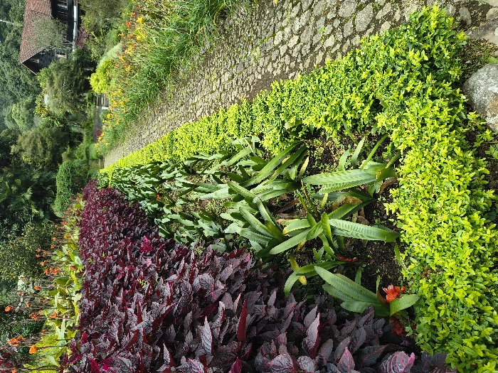A garden path is flanked by meticulously arranged flora. Deep burgundy plants form a vibrant border, transitioning into broad green leaves. A dense, lime-green hedge lines the path's edge. A stone wall borders the hedge. The perspective creates a sense of depth, leading the eye toward a building in the background.
