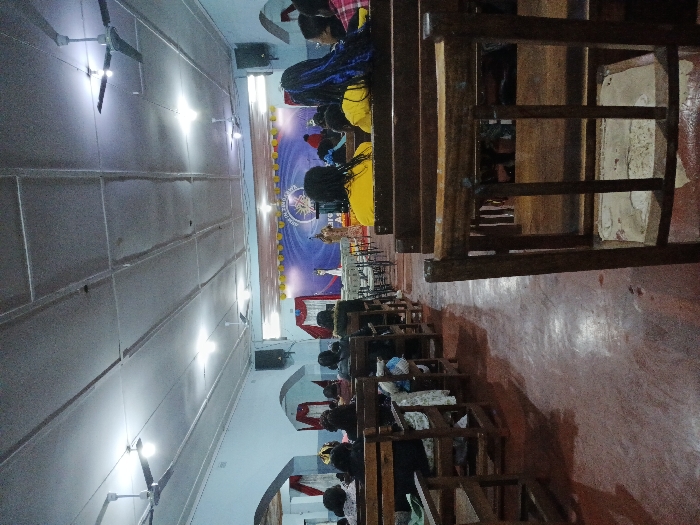 A wide shot of an auditorium with rows of chairs occupied by attendees facing a stage. The stage has a blue backdrop with a circular logo. Several people are on stage. Ceiling fans are visible on the high ceiling. The auditorium has a pale blue color scheme and is lit by overhead lights. The floor appears to be red. The image is slightly tilted.