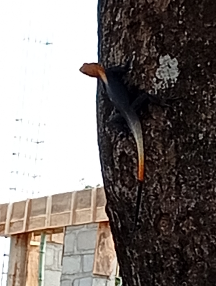 - "A male agama lizard, characterized by an orange-red head, dark body, and a tail that transitions to an orange-brown tip, is positioned vertically on the dark, textured bark of a tree trunk" by FM-pinCd2, licensed under CC BY 4.0