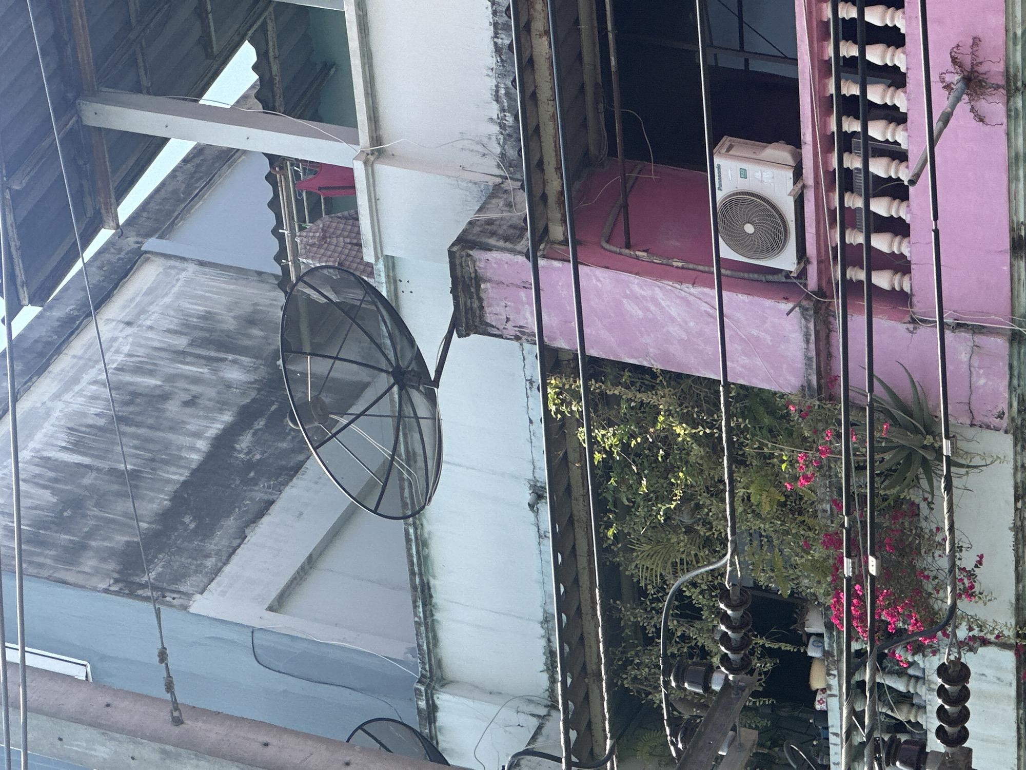 low-angle view of a cityscape in Pattaya City, Thailand. The architecture is a mix of aging, multi-story buildings with a variety of exterior finishes. Some buildings are painted in pastel colors, including blue and pink, while others have a weathered gray appearance. Satellite dishes are mounted on the buildings, suggesting the prevalence of television services. Tangled networks of electrical wires and communication cables are strung across the foreground and midground, creating a dense visual clutter. Greenery, including flowering vines and potted plants, is visible on the buildings and around the utility poles, softening the harshness of the urban environment. An air conditioning unit is mounted on a pink wall behind an ornate vertical grill. The image suggests a dense urban setting with a mixture of residential and commercial buildings.