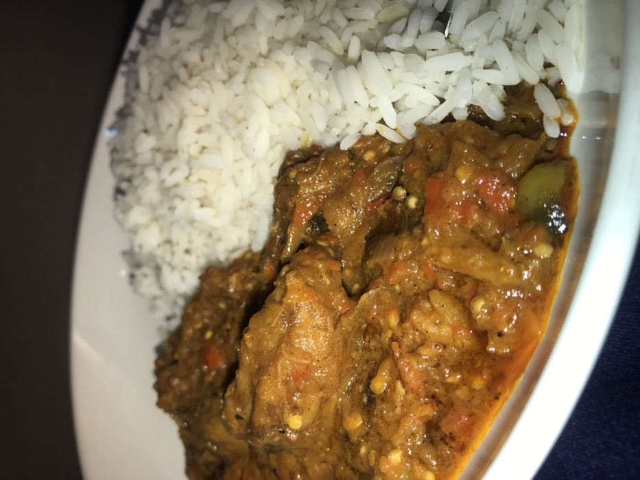 A close-up, high-angle photograph depicts a meal served in a white, shallow ceramic bowl, observed in Galadimawa, Nigeria. The bowl contains two distinct culinary components: on the left, a sizable portion of a reddish-orange to brown stew, characterized by visible chunks of meat, finely diced red and green peppers, and a glossy, oily surface. This stew is bordered on the right by a generous serving of plain, cooked white long-grain rice. The immediate background is dark and uniformly out of focus, indicating an indoor environment with subdued lighting. A dark blue fabric or surface is partially visible beneath the bowl along the lower left edge of the frame. No individuals, actions, or interactions are present in the scene.