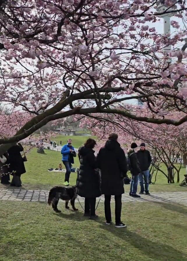 park area with many people gathered under cherry blossom trees. The trees are full of pink flowers, creating a canopy overhead. People are walking, standing, talking, and taking pictures. A dog is also present, being held on a leash by a person. The scene appears to capture a pleasant, leisurely atmosphere in a park during springtime. A tower is visible in the background.