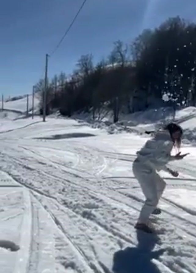woman in a white snowsuit on a sunny day at a snowy location. She is crouching, playing with the snow, and throwing snowballs. There are tracks in the snow suggesting vehicles or snowmobiles have passed through. In the background, there is a line of trees on a snowy hillside. The sky is blue with the sun shining brightly.