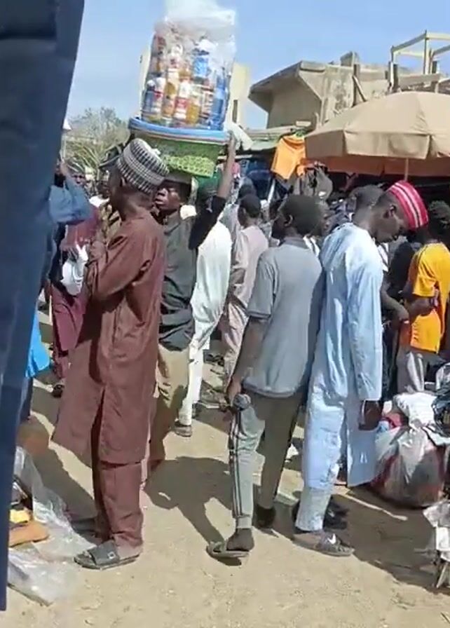 busy outdoor market scene with a variety of people and activities. The main focus is on a young man carrying a large basket of goods on his head as he walks through the crowd. The market appears to be located in an urban area. Many of the men are wearing traditional clothing. Other people are milling around, some engaged in conversation. The scene suggests a bustling economic activity.
