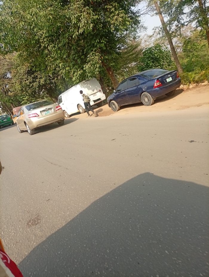 A street scene features a beige sedan, a white van, and a blue sedan parked near the roadside under leafy trees. A man in dark clothing is standing near the van. The asphalt road in the foreground occupies a significant portion of the frame, with a shadow extending into the view. There is also a green car further ahead. The overall scene has a slightly tilted perspective.