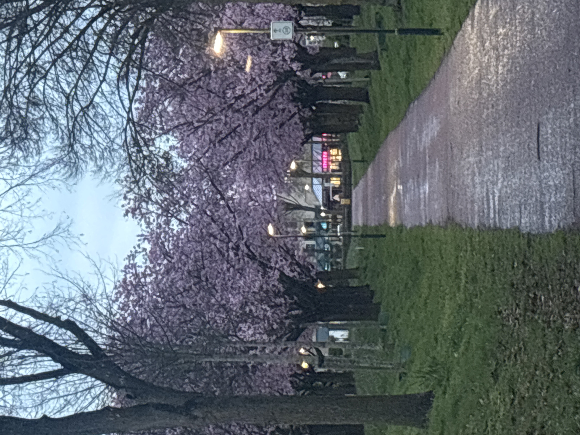 The scene depicts a tree-lined paved path in Helmond, Netherlands, viewed from a slightly elevated perspective. The reddish-brown path appears damp or wet, reflecting light, and extends centrally into the distance, bordered by manicured green grass on both sides. A double row of trees flanks the path; the trees immediately adjacent are in full bloom with dense clusters of pink/purple blossoms. Beyond these, taller trees with bare, dark branches are visible against an overcast, light blue-grey sky. Multiple streetlights with active, warm yellow illumination are positioned along the path. A streetlight pole on the right side displays a white rectangular sign featuring a circular symbol with a bicycle icon. In the background, beyond the trees, structures with illuminated signs are visible, including one with prominent red neon lettering. No individuals, animals, or vehicles are present.