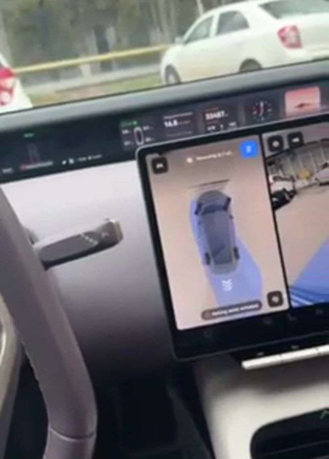 The camera is positioned inside a car, showing the dashboard, steering wheel, and digital screens. One screen displays a 3D rendering of the car and the surrounding parking space. The other screen shows a live camera view of the car's surroundings. The steering wheel is a light gray color with silver accents. The dashboard is a similar light gray color. The car appears to be engaging in a parking assistance feature, with an automated voice providing alerts. Outside the vehicle, other cars and trees are visible. The car's interior is well-lit.