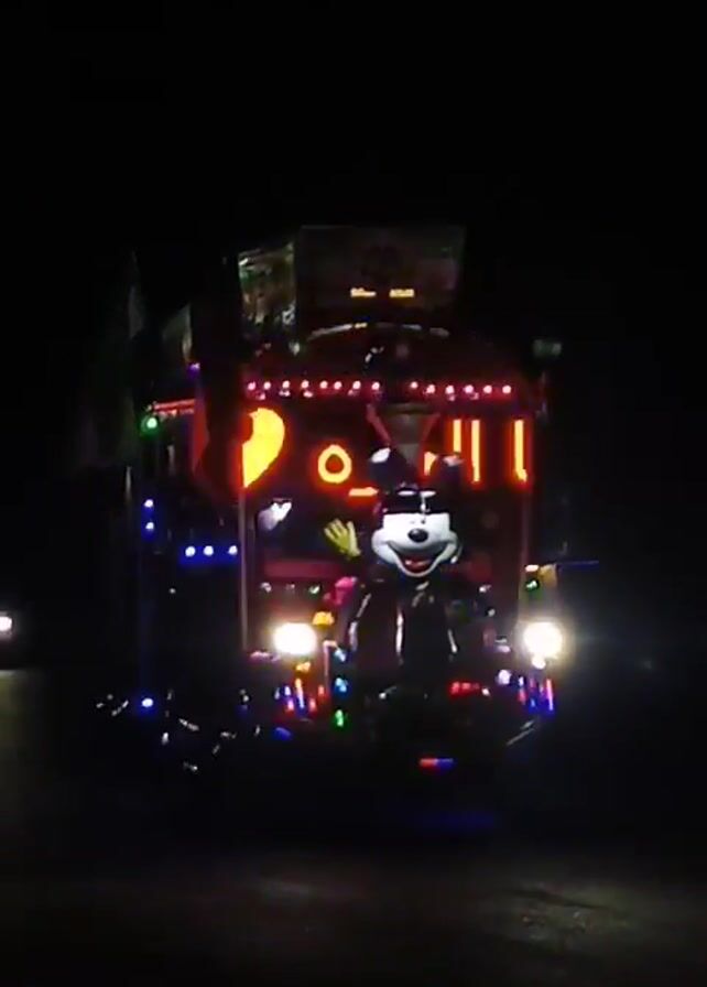 lit-up vehicle at night. The vehicle is decorated with flashing lights of various colors, including blue, red, and white. A figure of Mickey Mouse, wearing a dark jacket, is placed at the front, appearing to wave. Above Mickey Mouse, there's Arabic writing lit up in orange neon. The background is dark, with only a few indistinct shapes visible, suggesting an urban setting. The vehicle's lights change patterns, displaying different shapes such as hearts and smiley faces.