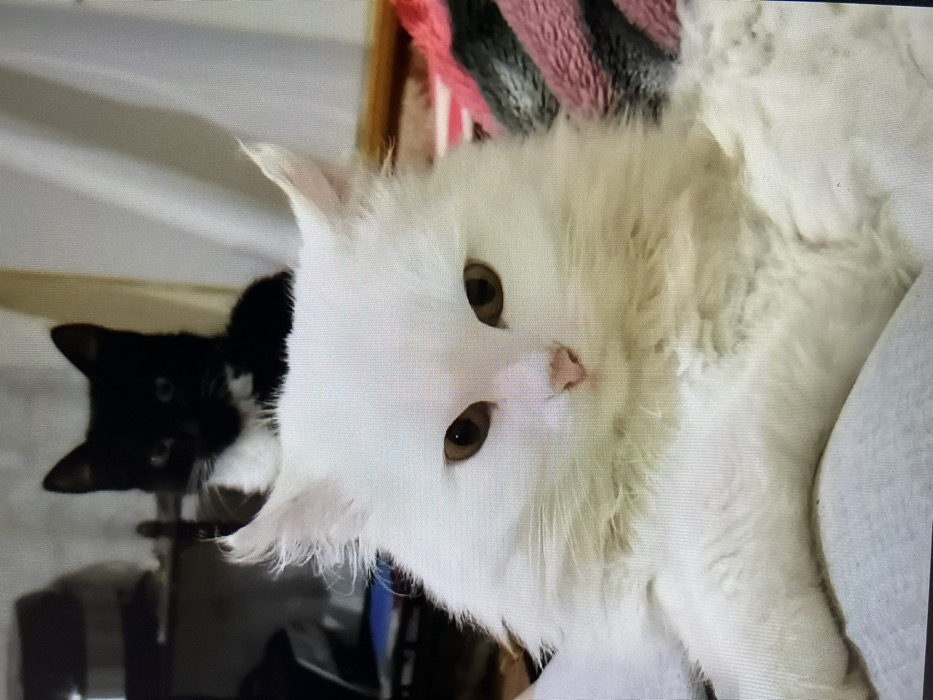 - "A fluffy white cat with golden eyes and a pink nose lies angled in the frame, its gaze directed towards the camera" by FM-qqtRn2, licensed under CC BY 4.0