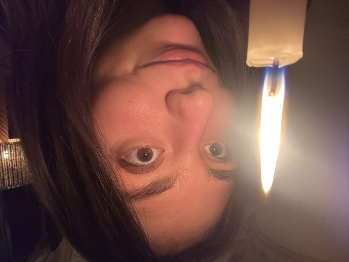 A woman with dark hair and brown eyes looks intently into the camera. Her face is lit from below by a bright candle flame, creating dramatic shadows and highlighting her features. The candle, partially visible in the upper right, casts an intense light on her face. The photo is taken at an unusual angle, giving it a slightly disorienting, perhaps unsettling, feel.