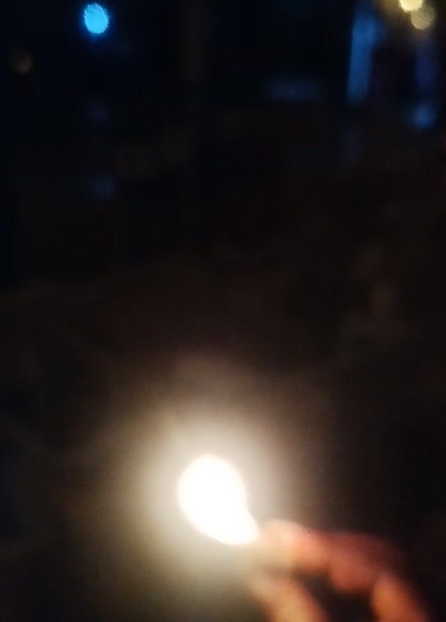 hand holding a small, round light, possibly a bulb, that is brightly lit. The rest of the environment is dark with only vague shapes visible, including what appears to be furniture and some indistinct blue lights in the background. The focus is clearly on the light and the hand holding it.