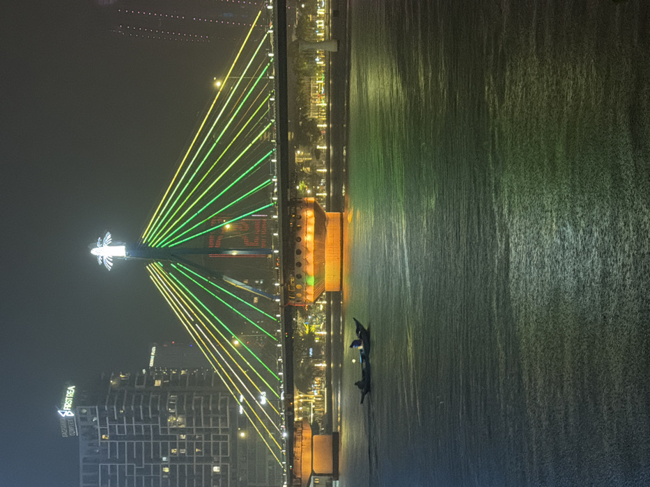 The image depicts a nighttime urban landscape in An Hải Ward, Da Nang, Vietnam, centered on the illuminated Trần Thị Lý Bridge over the Hàn River. The prominent cable-stayed bridge features a tall central pylon topped with a bright white, stylized winged figure. Numerous suspension cables extend from the pylon, illuminated in alternating green and yellow/lime colors. The bridge deck, carrying visible traffic, is illuminated along its length. Beneath the bridge, a large cylindrical support structure in the water glows orange. In the lower-left quadrant, a small, dark-colored, flat-bottomed boat navigates the river, moving from left to right and leaving a subtle wake. Two individuals are visible within the boat; one figure in a light-colored garment is positioned toward the front, while a second, less distinct figure is situated further back. The river's surface is dark but textured with fine ripples, indicating either light precipitation or minor currents, and reflects the colorful artificial lights from the bridge and city. The background on the far riverbank features several illuminated high-rise buildings, including one displaying "FIRST REA" and "DAEHWAN GOLDTREE" signs. The sky is dark, suggesting an overcast night, with artificial light sources providing the primary illumination for the scene.