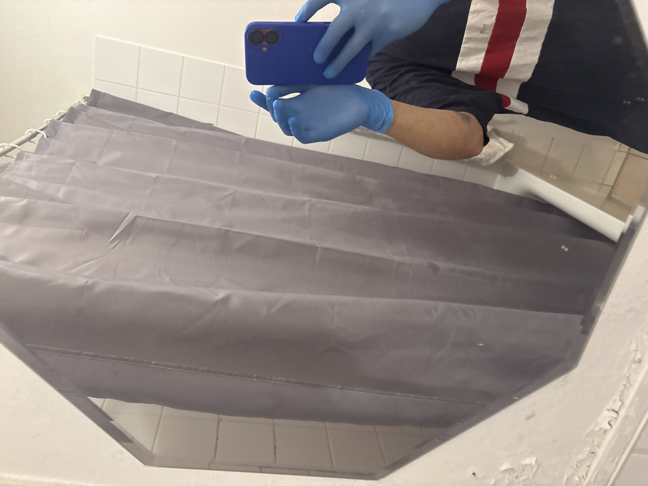 An indoor scene in Dresden, Germany, captured as a mirror selfie in a bathroom. The reflection shows an individual's upper torso and arms. The person wears a dark blue polo shirt with a white and red horizontal stripe. Both hands are covered in light blue disposable gloves. The reflected right hand holds a smartphone in a bright blue case, angled to photograph the mirror. A grey, translucent shower curtain, hung on a white rod with rings, occupies most of the background reflection, covering a shower or bathtub enclosure. White ceramic tiles are visible on the wall behind the shower curtain. The wall below and to the left of the hexagonal mirror shows extensive peeling white paint or plaster. A white bathtub or shower basin is partially visible in the lower right reflection. The mirror surface exhibits minor smudges and dust.