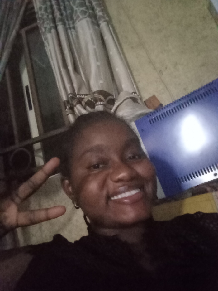 A smiling woman is angled toward the viewer, throwing up a peace sign with her left hand. She has dark hair, and her teeth are visible. Behind her, patterned curtains partially obscure a window. A blue object with a perforated edge is visible at the top right. The overall lighting in the image is soft, and she appears to be indoors.