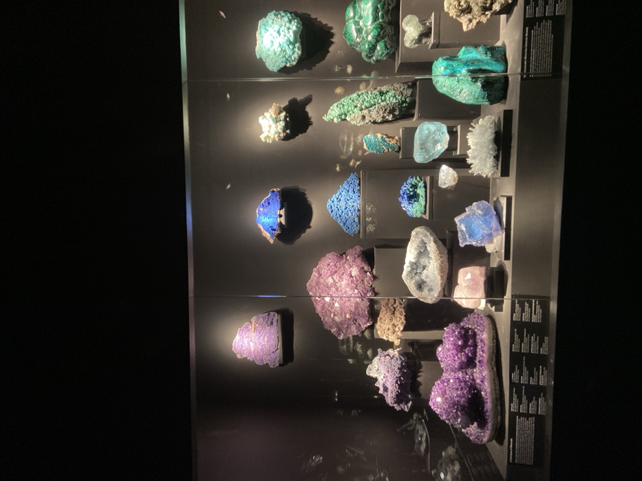 glass display case containing 15 mineral specimens in a museum at the American Museum of Natural History located in New York City at the coordinates 41.02, -73.623. The display case is lit from above and contains several different types of minerals, including amethyst, malachite, azurite, and fluorite. The specimens are arranged in a random pattern, and are separated by black velvet-lined shelves. The glass case has a dark background, which makes the minerals stand out. The minerals are all brightly colored and have a variety of shapes and sizes. Some of the minerals have been polished, while others have not. The image was taken with a phone camera, and the image is of medium quality. The scene is lit by artificial light. There are no people or other animals in the image.
