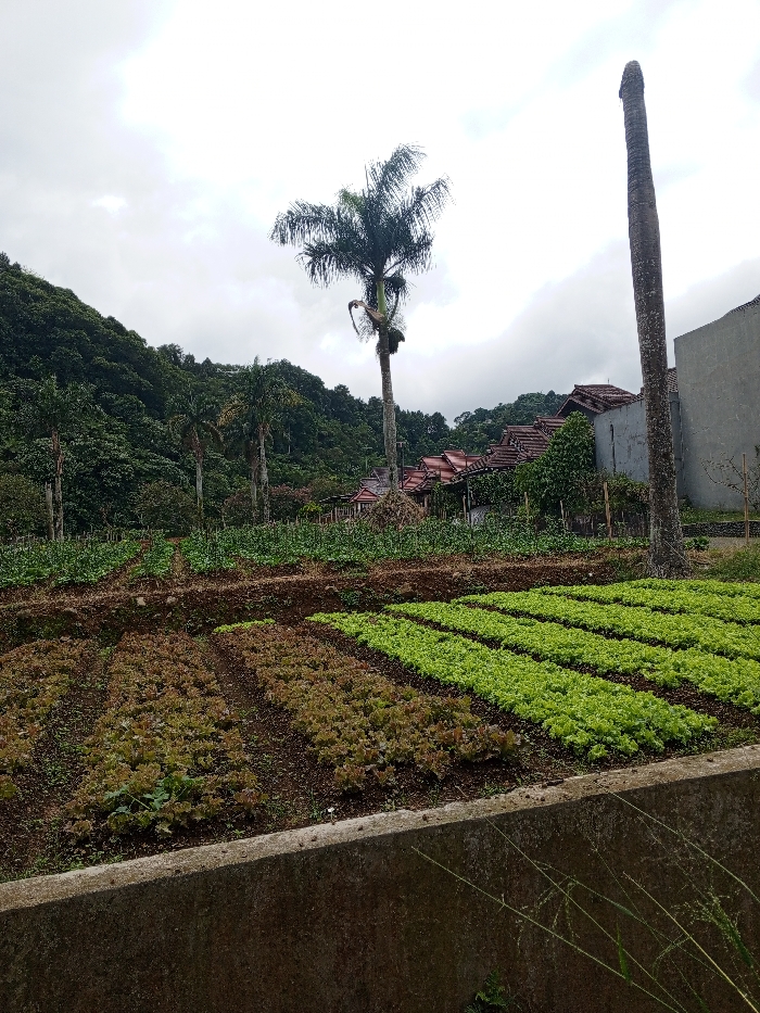 The image displays an agricultural landscape in Catarman, Philippines, under an overcast sky. In the foreground, a dark gray concrete barrier runs horizontally across the lower portion. Immediately beyond this barrier, a cultivated field is divided into rows of distinct crops. On the left, multiple rows of reddish-brown leafy plants are visible, while to their right, parallel rows of bright green leafy plants extend across the field. The soil between the rows is dark brown. In the mid-ground, a tall palm tree with a crown of fronds stands centrally. To its right, an exceptionally tall, slender palm trunk, devoid of fronds, rises beside a two-story gray concrete building. Further back, a cluster of residential structures with reddish-brown tiled roofs is visible, partially obscured by intervening trees and vegetation. The background is dominated by a steep, densely forested hillside covered in dark green foliage. No individuals are present or engaged in any discernible actions within the frame.