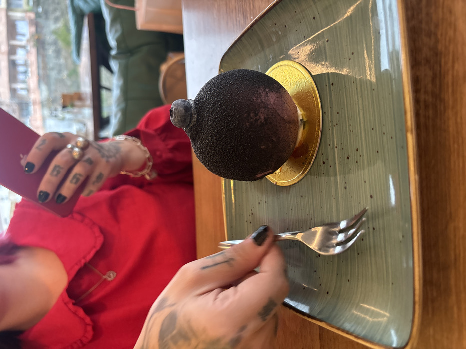 An indoor scene depicts two individuals seated at a wooden table in a café or restaurant in Ulcinj - Ulqin, Montenegro. In the foreground, a dark-tattooed hand with black nail polish holds a silver fork, positioned over a light green rectangular plate with a gold rim. On the plate, a spherical dark dessert with a textured, possibly speckled, surface rests on a small gold doily. A single blueberry garnishes the top of the dessert. In the mid-ground, a person wearing a red top with a ruffled collar is visible, holding a red smartphone in their left hand. This hand also displays black nail polish, rings on the fingers, a bracelet, and tattoos. A silver necklace with a pendant is visible on their neck. The background is blurred, showing a dark green upholstered chair, a wooden table, and an exterior view through a window, revealing blurred building facades.
