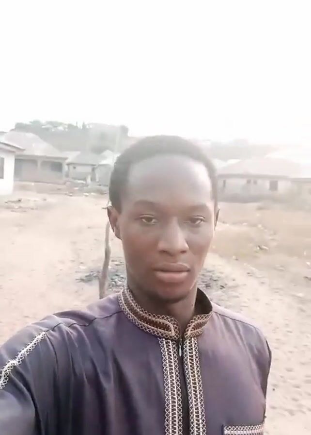 A young man is recording a selfie video. He is standing outside on a dirt road. In the background, there are small, simple buildings. The man is wearing a long-sleeved, dark purple shirt with gold embroidery around the collar and placket. He raises his right hand to his forehead, as if shielding his eyes from the sun. He then looks around. The sky is bright, suggesting it is daytime.