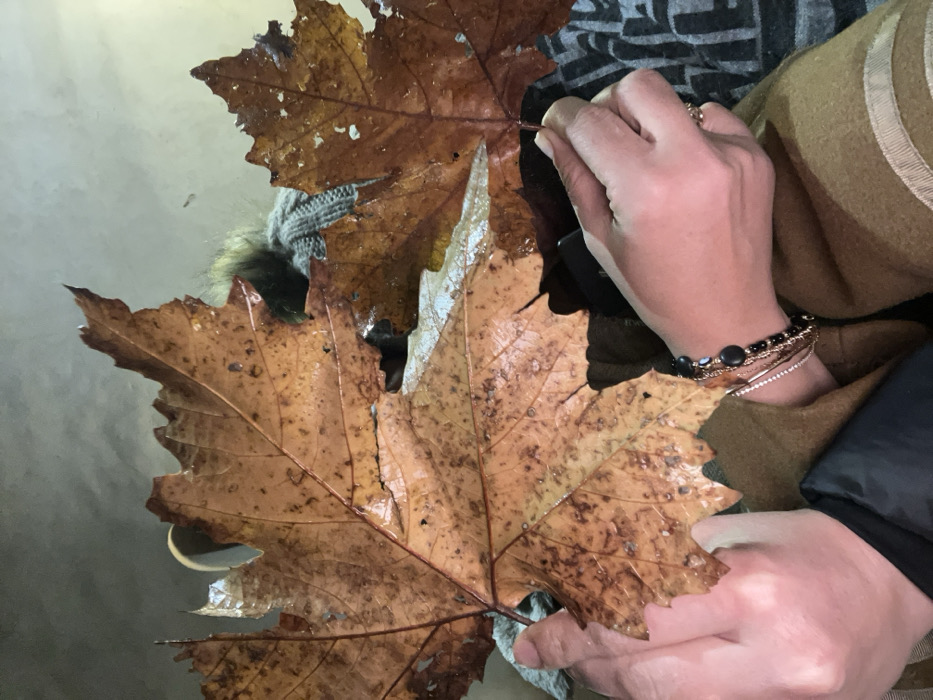 Two large, brown, wet leaves occupy most of the frame. A hand holds one leaf, showcasing bracelets on the wrist. Part of a patterned grey top, a tan coat, and a black garment are also visible. The background appears blurry and indistinct. The leaves display intricate veins and textures, with some tears and imperfections.