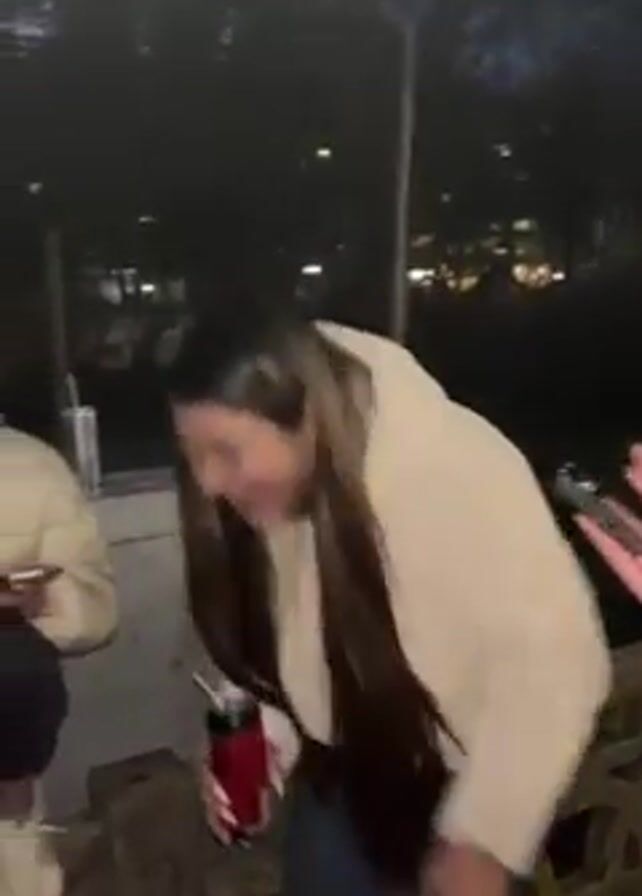 four young women outdoors at dusk. One woman stands holding a red beverage can and making a hand gesture with two fingers raised. Another person holds out a lit flashlight and a small white object towards the first woman. The other two women are crouched down and looking at electronic devices, possibly phones. One woman in the back laughs. The setting appears to be a park area. The lighting is dim, with visible streetlights.