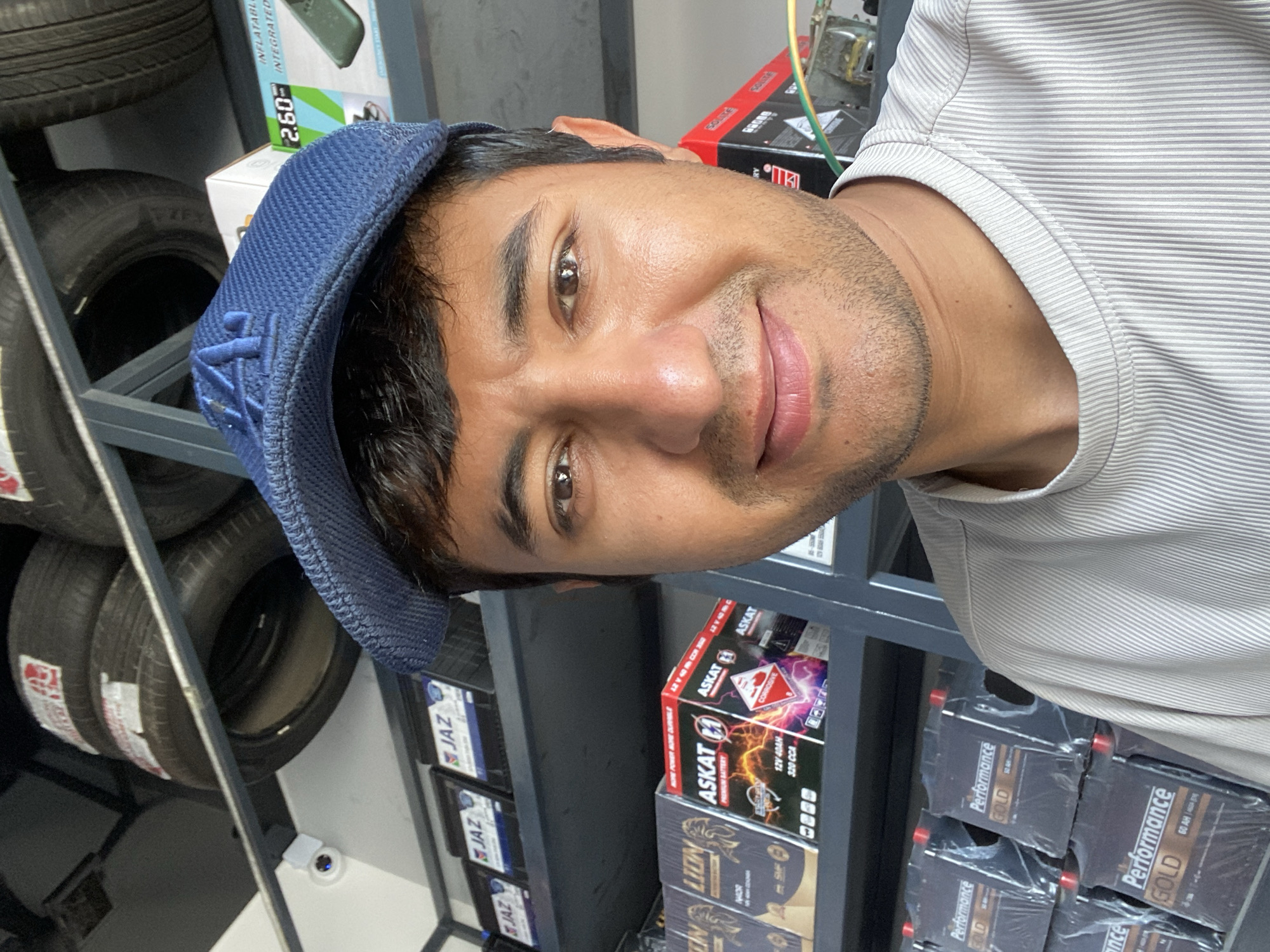 man with dark hair and eyes, wearing a blue cap and a light-colored striped shirt. He is smiling slightly. Behind him, shelves are stocked with various items including tires, car batteries (brands "JAZ", "ASKAT", "LION", "Performance GOLD"), and possibly other automotive accessories ("SOLITE" batteries, "INFLATAB INTEGRATED" product). The brand name "JAZ" is visibly repeated on some of the items. The location appears to be a shop, possibly an auto parts store. There is no information in the image that can confirm its location to the city of Bukhara, Uzbekistan.