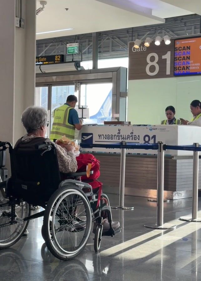 n elderly woman sitting in a wheelchair in an airport. She is eating something from a paper bag. In front of her is a gate counter labeled "Gate 81." Behind the counter, two airline employees are working. To the left, a porter wearing a neon yellow vest is standing near the doorway that leads to the aircraft. A sign indicates that Gate 82 is to the left. The floor is shiny and reflective.
